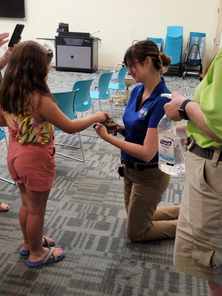Attendees learned which of those animals were non-native, differences between them and similar species (ex: turtles versus tortoises, millipedes versus centipedes), their diets, and other interesting facts. They also got to pet the turtle!