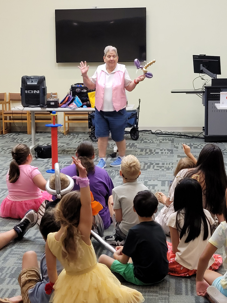 The fourth Friends-sponsored Live from the Library program on 7/21/23 featured Glenda Howell from Art-Z-Faces. Over 70 attendees sat enthralled as she twisted balloons into art, both large and small.