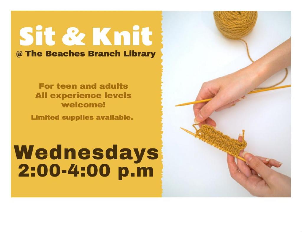 Stop by the Beaches Branch Library for Sit & Knit gatherings on Wednesday from 2-4PM. No pre-registartion required!